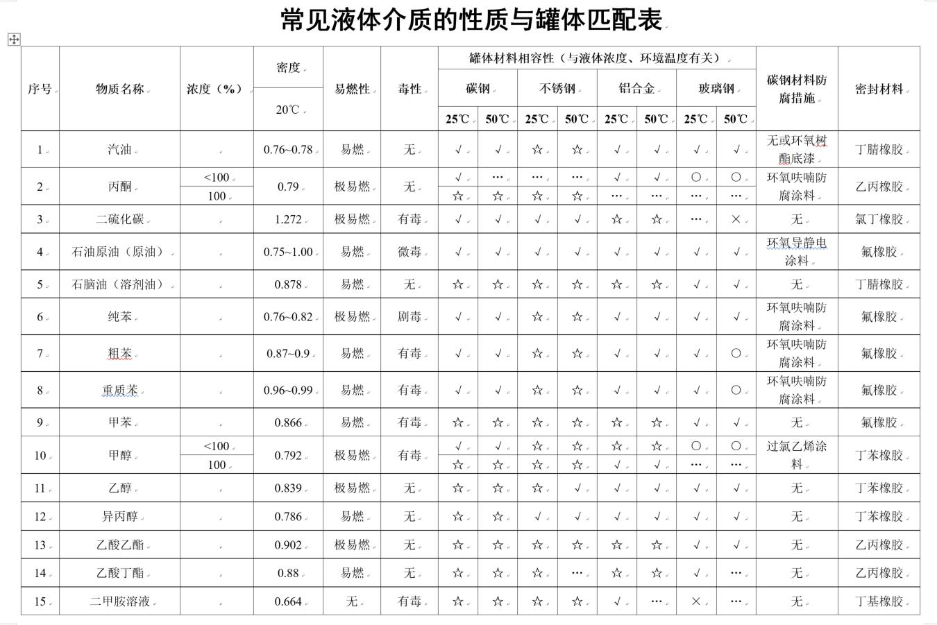 常見液體介質(zhì)的性質(zhì)與罐體匹配表