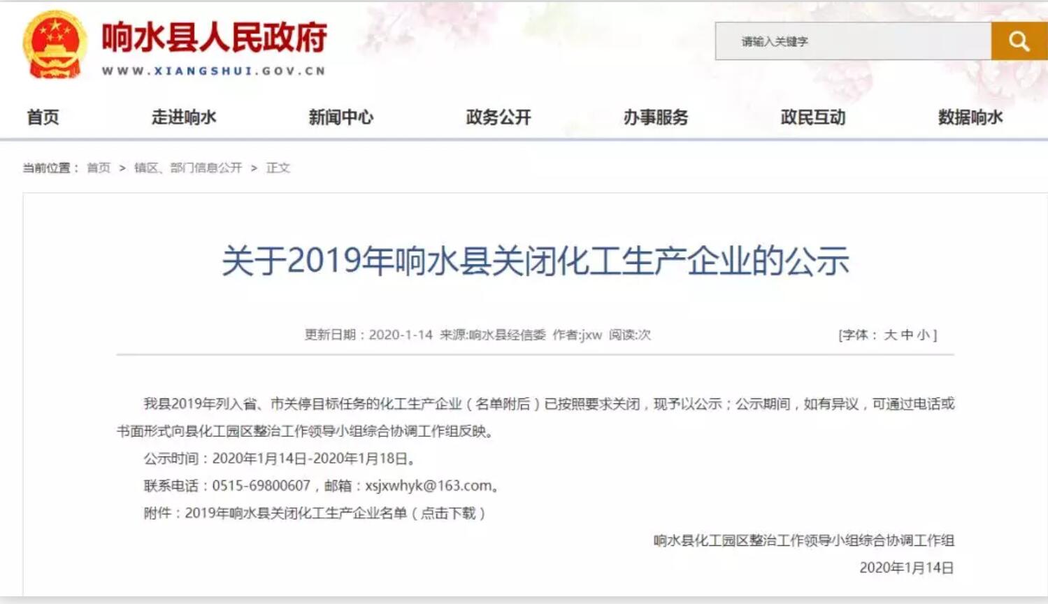 2019年響水縣關(guān)閉化工生產(chǎn)企業(yè)名單
