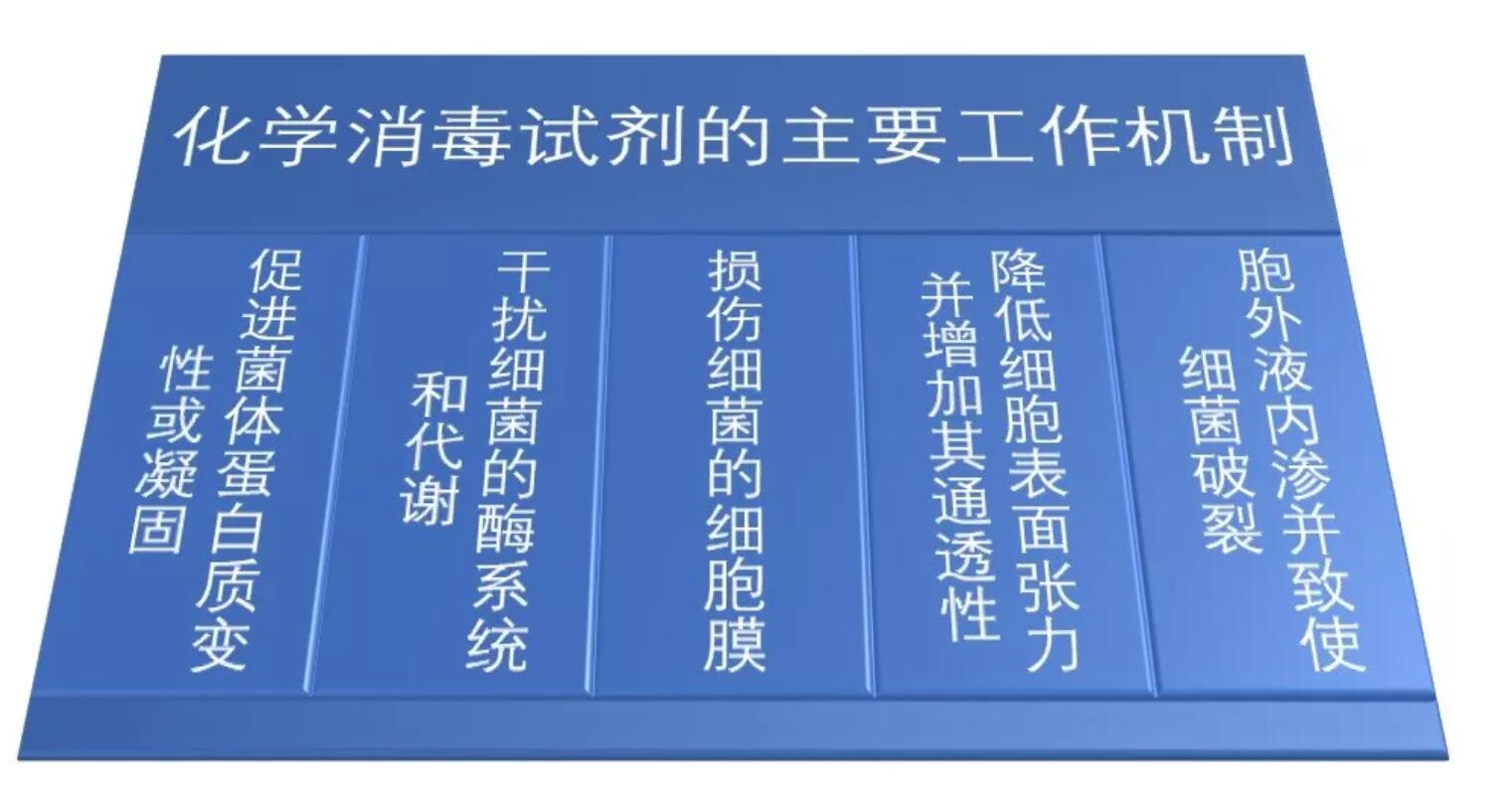 化學(xué)消毒試劑能夠影響細(xì)菌的化學(xué)組成、物理結(jié)構(gòu)和生理活動,從而發(fā)揮消毒或滅菌的作用?;瘜W(xué)消毒試劑的工作機(jī)制主要包括促進(jìn)菌體蛋白質(zhì)變性或凝固、干擾細(xì)菌的酶系統(tǒng)和代謝、損傷細(xì)菌的細(xì)胞膜、降低細(xì)胞表面張力并增加其通透性、胞外液內(nèi)滲并致使細(xì)菌破裂等。