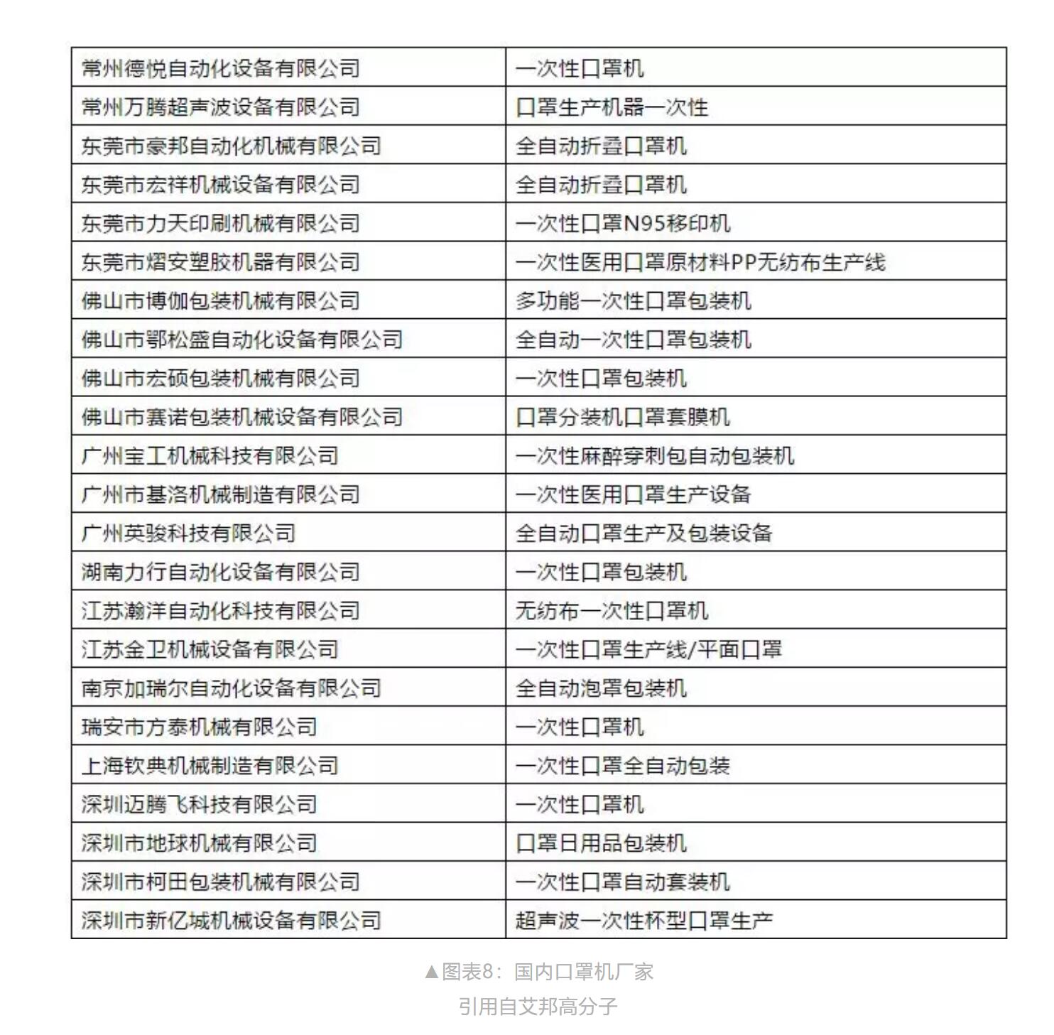 口罩機(jī)廠家大部分在東莞。(東莞利瀚,東莞創(chuàng)煜,東莞粵藝順,東莞快裕達(dá),東莞橫銳,南方力勁,廣東斯瑞凱),主要廠家名單如圖表8所示。