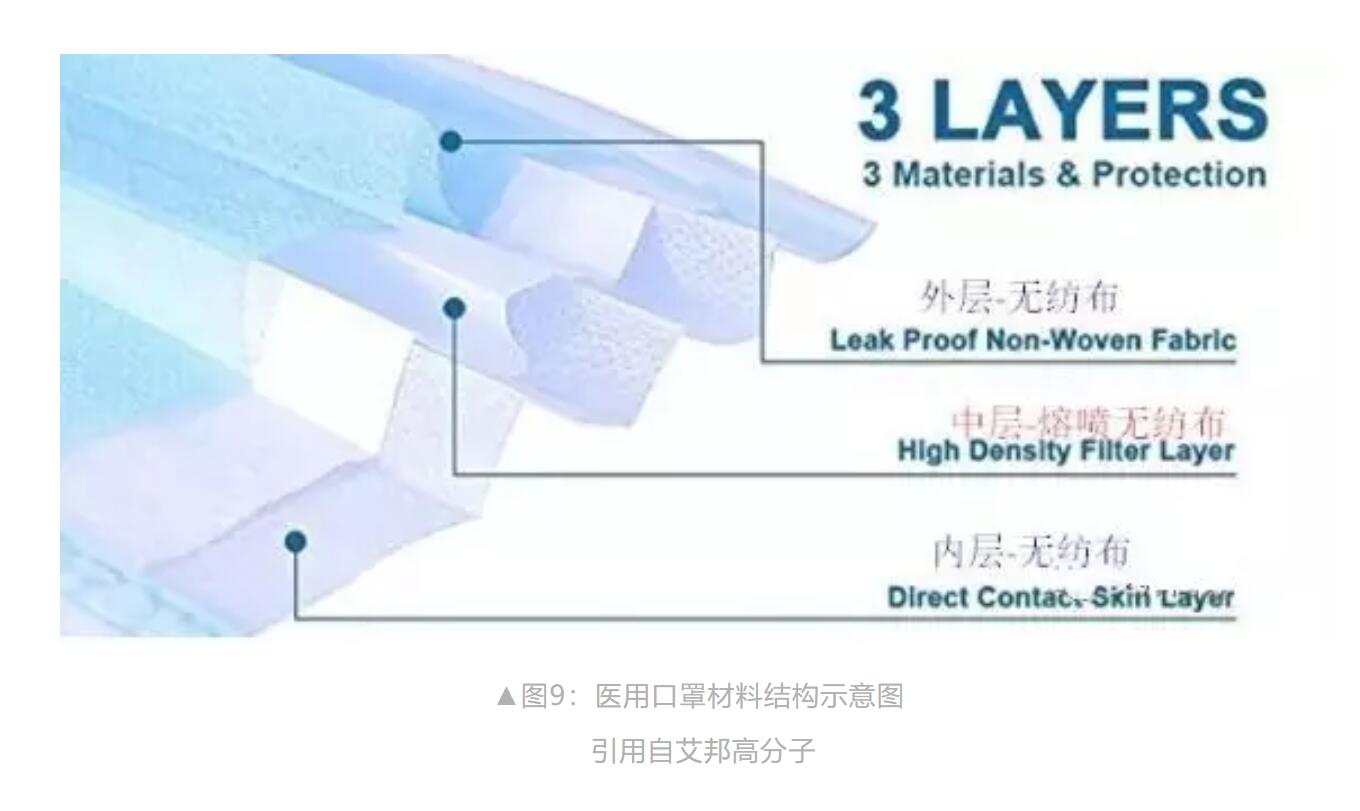 醫(yī)用外科口罩一般是由三層無紡布制成,如圖8所示。材料是紡粘無紡布+熔噴無紡布+紡粘無紡布(如圖9),起過濾效果的主要部分是極細(xì)密且?guī)ъo電的內(nèi)層過濾布——熔噴無紡布,它的主要材質(zhì)是高熔指聚丙烯,經(jīng)過靜電駐極處理后達(dá)到所要求的過濾效率。