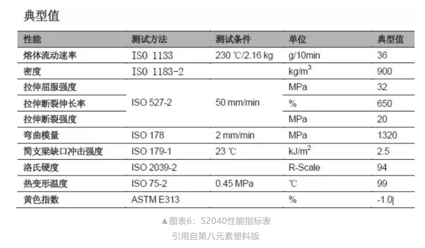 材料要求:高強(qiáng)度。推薦材料:熔體指數(shù)在25~60聚丙烯,比如??松梨贓xxon-Mobile的和上海賽科的2040都是很好的紡粘材料,如S2040性能指標(biāo)如圖表6所示。
