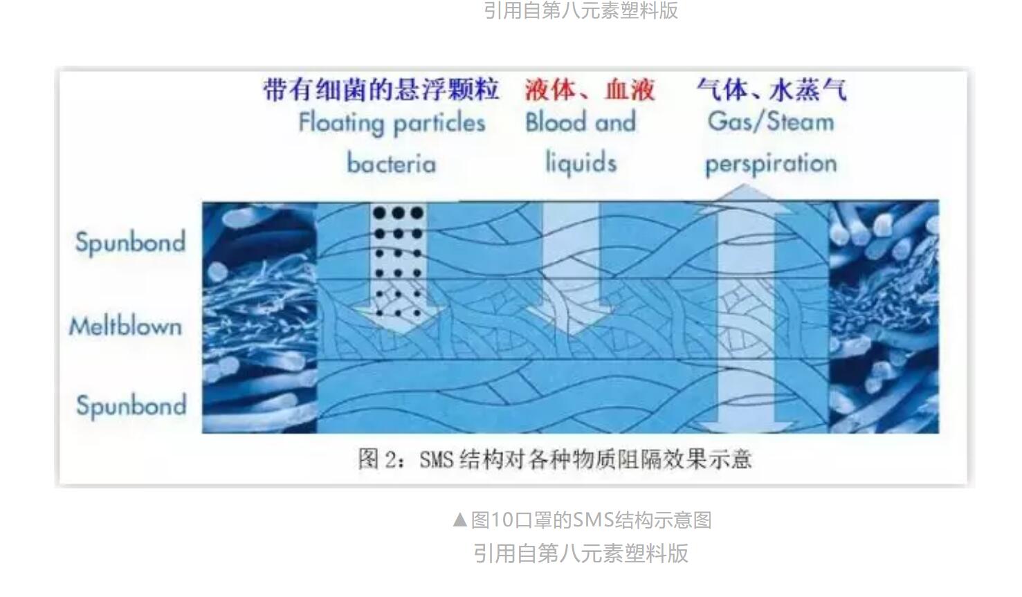 這里面紡粘層其纖維直徑比較粗,在20微米左右,2層S紡粘層主要作用是支撐整個(gè)無紡布結(jié)構(gòu),對阻隔并沒有太大的作用。口罩里面最重要的是阻隔層即熔噴層,熔噴層的纖維直徑比較細(xì),在2微米左右,所以只有紡粘層直徑的十分之一,這個(gè)對防止細(xì)菌、血液滲透起至關(guān)重要的作用,經(jīng)過靜電處理后達(dá)到所要求的過濾效率。如果S紡粘層過多,口罩就比較硬,而熔噴層M過多,則呼吸比較困難,所以從口罩呼吸的難易程度可以判斷口罩的隔絕效果,呼吸越困難,則阻隔效果更好,但是,如果M層變?yōu)楸∧?,就基本上不能呼吸了,病毒是阻隔了,人也快不行了,所以,這也是一個(gè)技術(shù)問題。