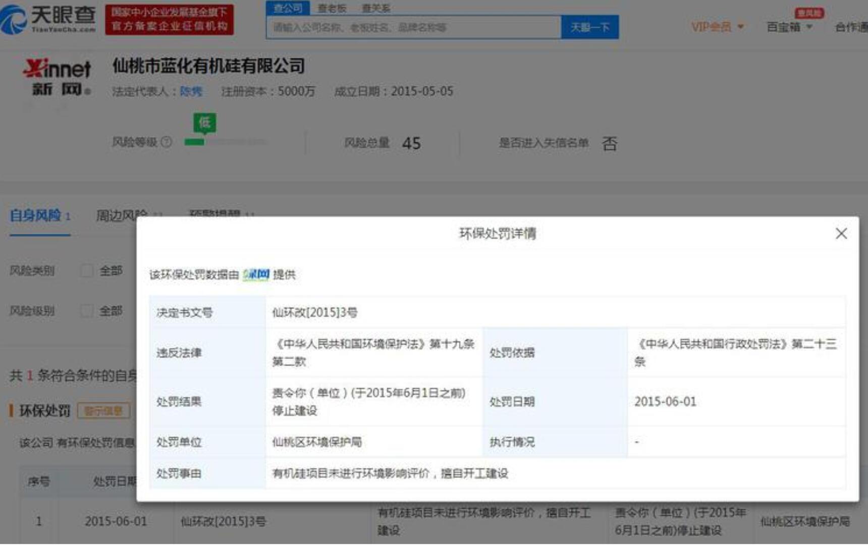 值得注意的是,2015年6月1日,藍(lán)化有機(jī)硅有限公司因有機(jī)硅項(xiàng)目未進(jìn)行環(huán)境影響評(píng)價(jià),擅自開(kāi)工建設(shè),仙桃區(qū)環(huán)境保護(hù)局責(zé)令其(單位)(于2015年6月1日之前)停止建設(shè)。