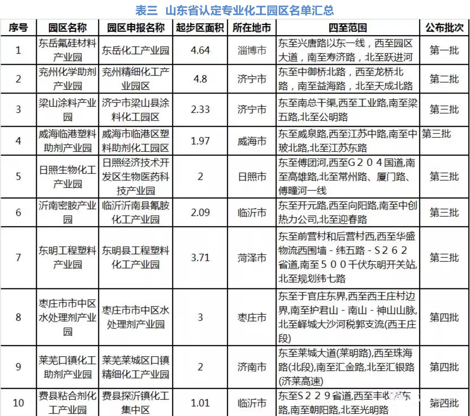 表三  山東省認(rèn)定專業(yè)化工園區(qū)名單匯總